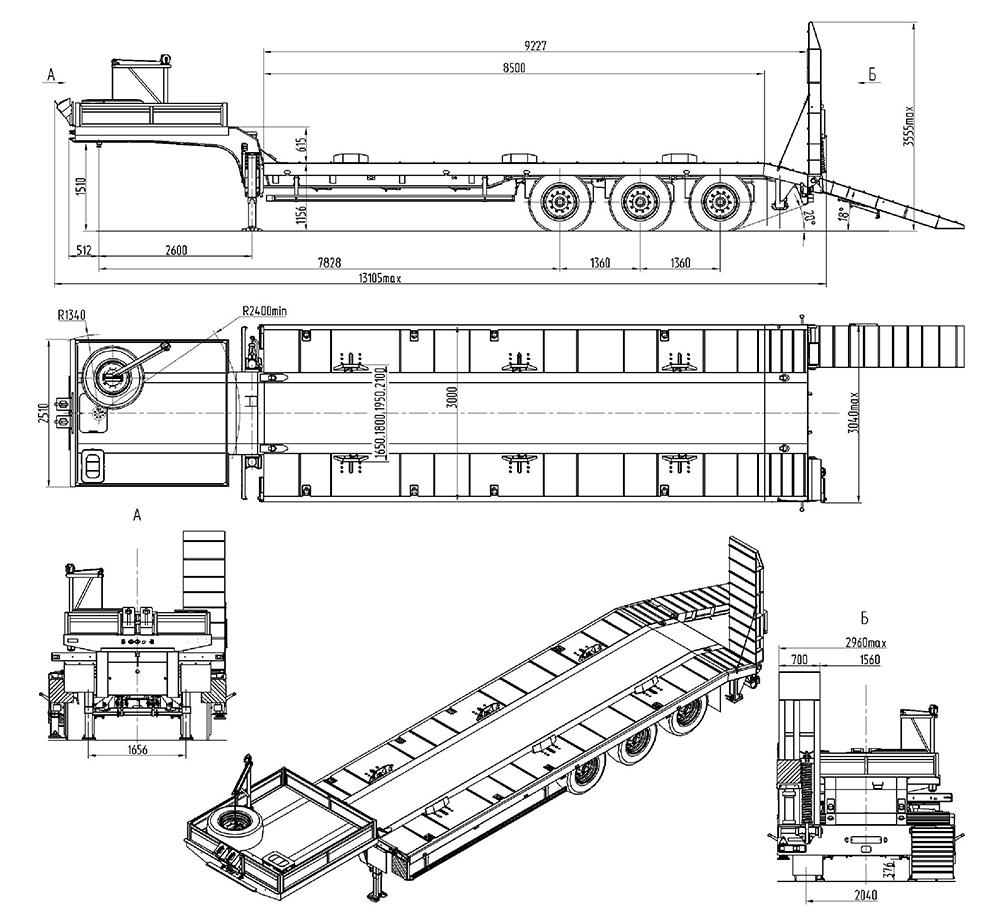 39000 кг, шины 385/65R22,5 или 445/65R22,5 / 6+1, платформа 11080 до трапов) x 2500 с уширителями до 3000 мм, ССУ 1510 мм, пневматическая или рессорная подвеска, съемные стойки 1500 мм, механические трапы