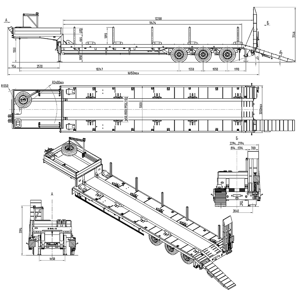 39000 кг, шины 385/65R22,5 или 445/65R22,5 / 6+1, платформа 11080 до трапов) x 2500 с уширителями до 3000 мм, ССУ 1510 мм, пневматическая или рессорная подвеска, съемные стойки 1500 мм, механические трапы