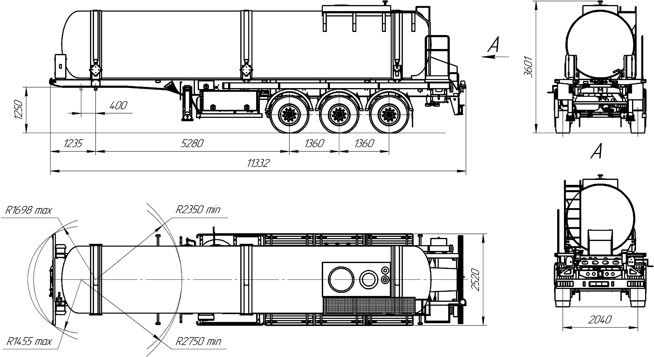 Материал: химстойкое стекловолокно, емкость: 30 куб.м., сечение круглое, конструкция: однослойная или трехслойная (текловолокно + утеплитель + стекловолокно), крепление: при помощи стяжных лент, перевозимые жидкости: нефть, автошины 385/65R22,5; первая ось - подъемная.